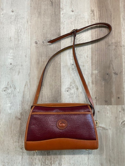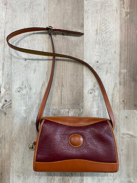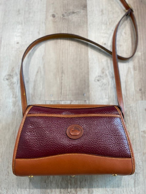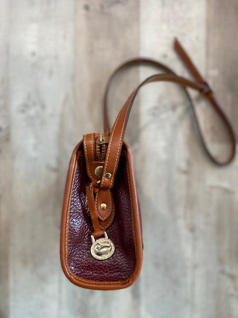 This thrifted find is a Vintage Dooney & Bourke Burgundy & Cognac All Weather Leather Crossbody Bag. It is in beautiful condition with a brass duck medallion.