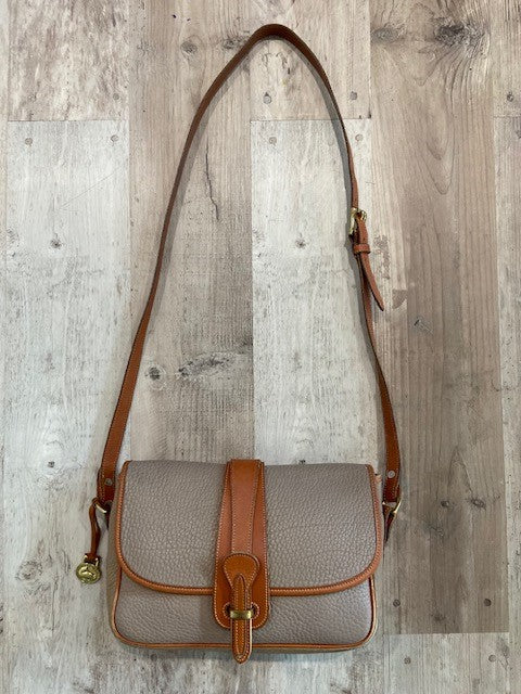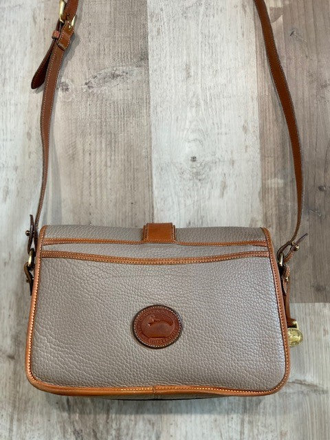 This thrifted find is a 90s Vintage Dooney & Bourke Tan & Cognac All Weather Leather Satchel Bag. It is in beautiful condition with a brass duck medallion.