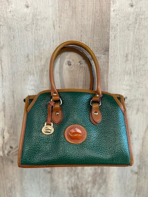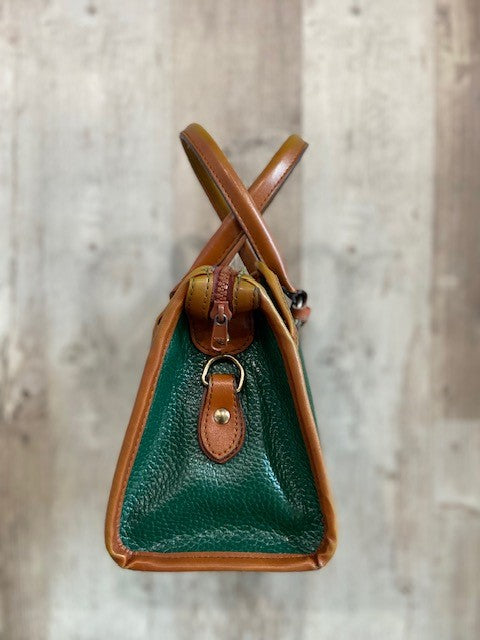 This thrifted find is a 90s Vintage Dooney & Bourke Green & Cognac All Weather Leather Handbag with a brass duck medallion. It is in beautiful condition with some light wear on the handles.