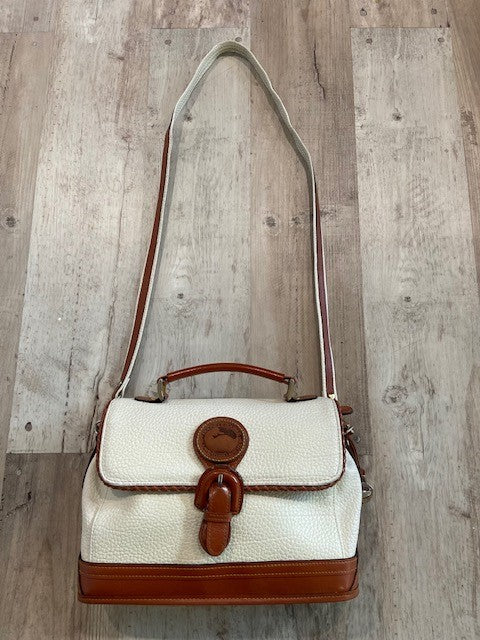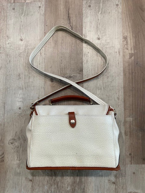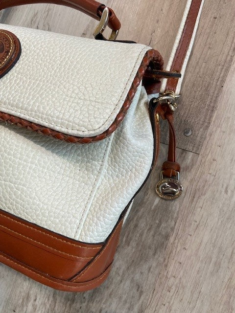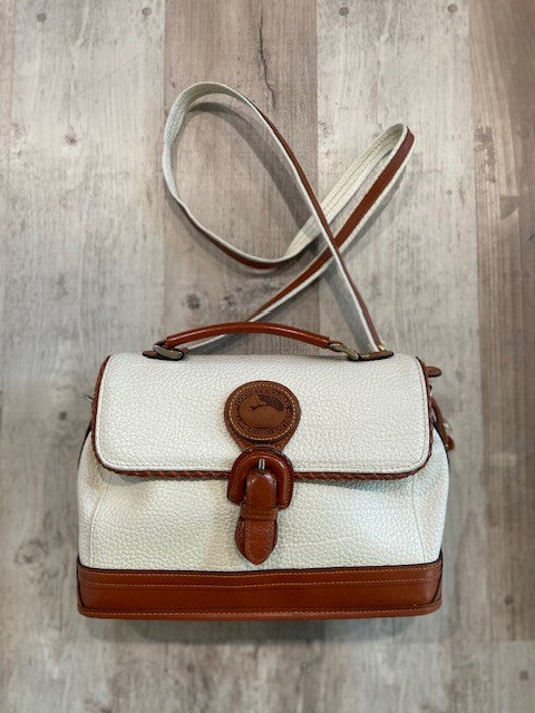 This thrifted find is a 90s Vintage Dooney & Bourke Cream & Cognac All Weather Leather Mini Briefcase Crossbody Bag. It is in beautiful condition with a brass duck medallion.